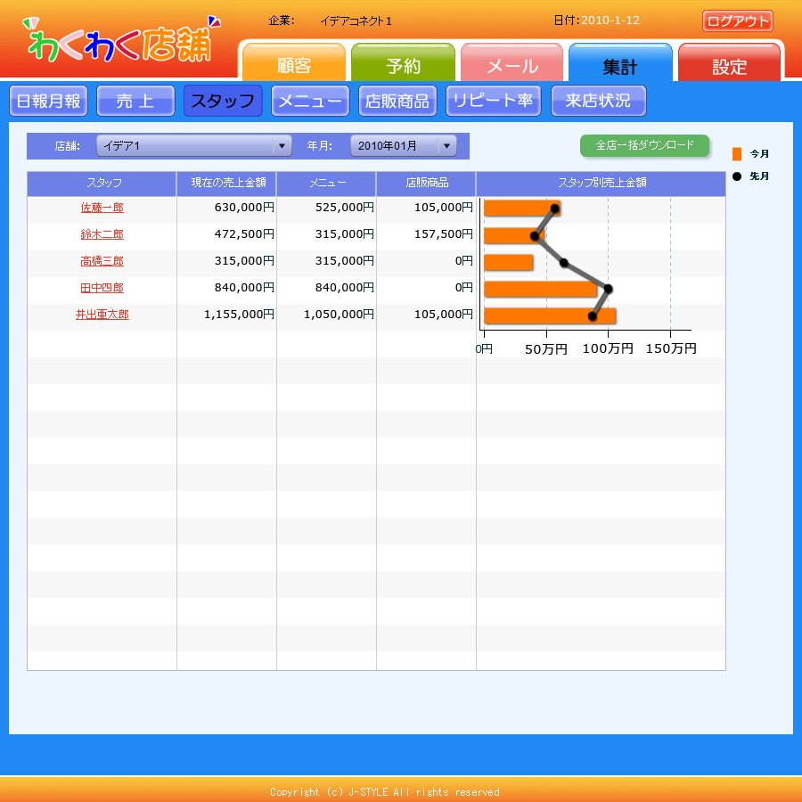 店舗毎、スタッフ毎、商品毎に販売実績や売上を詳細に分析。